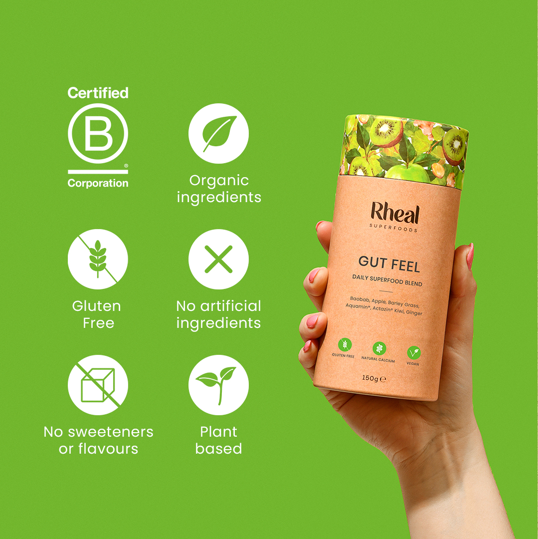 Our products are of the highest quality - something which makes Rheal special. Gut Feel is certified Organic by OF&G, is 100% plant-based and gluten free. Just the best superfoods to support our gut health.