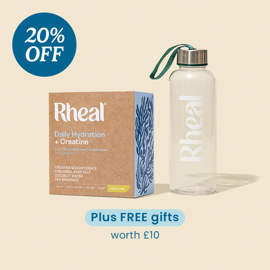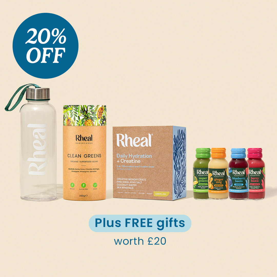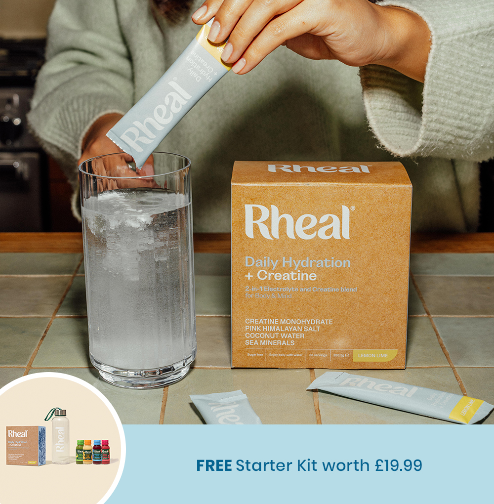 Get your Starter Kit with a FREE Rheal Bottle, and a FREE sample pack of our wellness shots - all worth £20. Plus save 25% off your first three orders. Limited time offer.